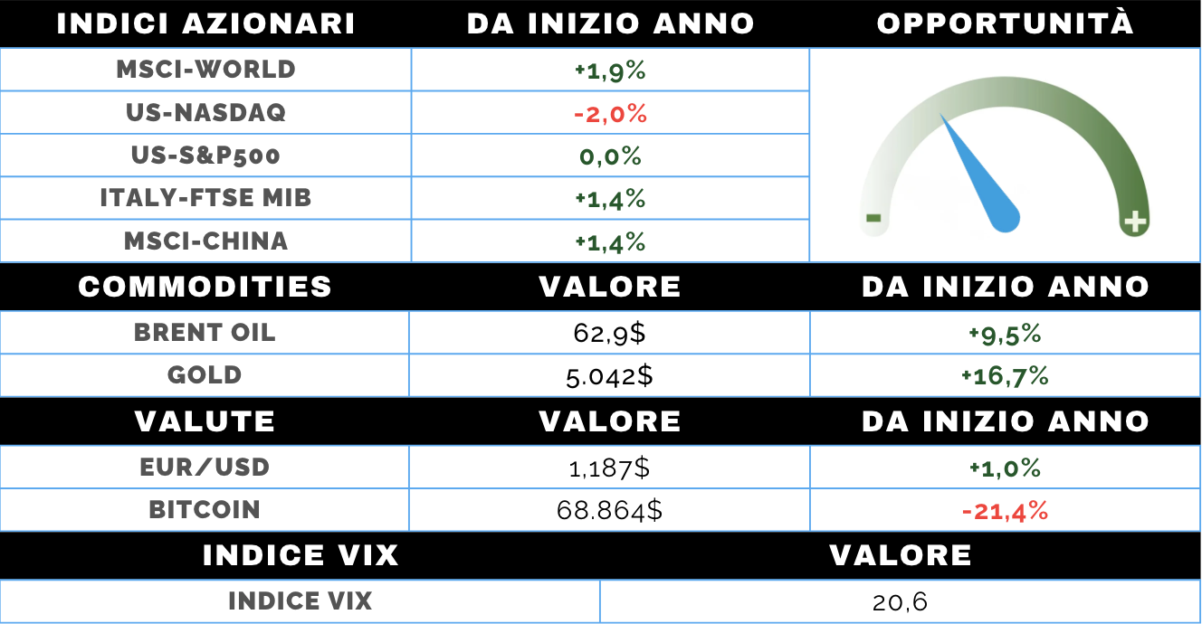 Il tono dei mercati azionari resta caratterizzato da frequenti cambi di direzione, soprattutto a livello settoriale. Negli Stati Uniti continua la difficoltà delle large cap tecnologiche, appesantite dai dubbi sulla sostenibilità degli ingenti investimenti legati all’intelligenza artificiale e sui possibili effetti di disintermediazione dei modelli di business tradizionali. Le novità provenienti dal mondo AI e fintech hanno colpito in particolare broker assicurativi, risparmio gestito, logistica e real estate, alimentando un clima di “ansia da disruption” che favorisce una rotazione verso titoli più difensivi o con asset tangibili e minore rischio di obsolescenza.