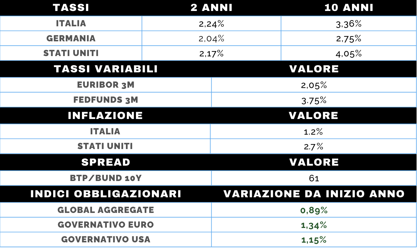 Settimana favorevole per l’obbligazionario governativo, con un generale calo dei rendimenti a medio-lunga scadenza sia negli Stati Uniti sia nell’area euro. In un contesto di maggiore incertezza sull’equity e di dati macro non univoci, i bond hanno recuperato il loro ruolo di asset difensivo, riportando performance positive da inizio anno.