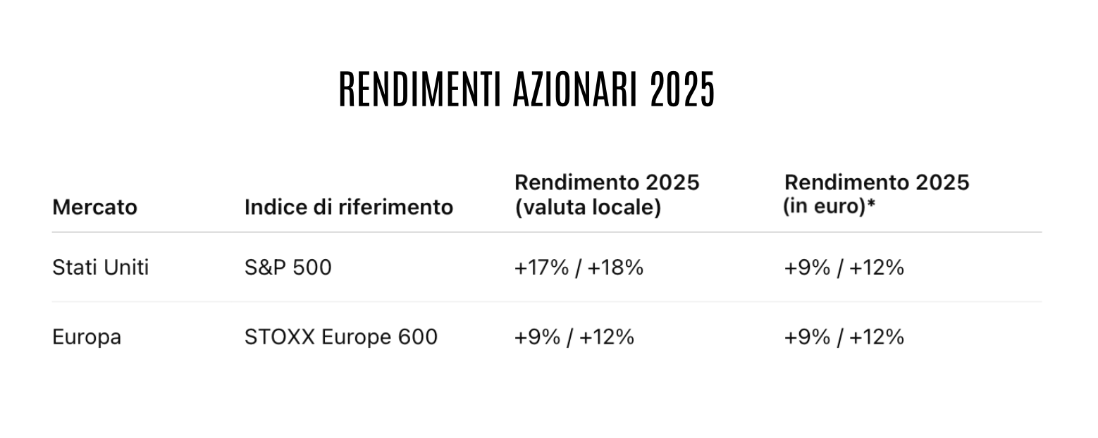 I mercati azionari europei hanno mostrato una crescita più moderata, coerente con un contesto macroeconomico debole, ma hanno beneficiato di valutazioni iniziali più contenute. Per l’investitore in euro, questo ha significato rendimenti meno spettacolari, ma anche una minore volatilità valutaria e una maggiore stabilità complessiva del portafoglio.