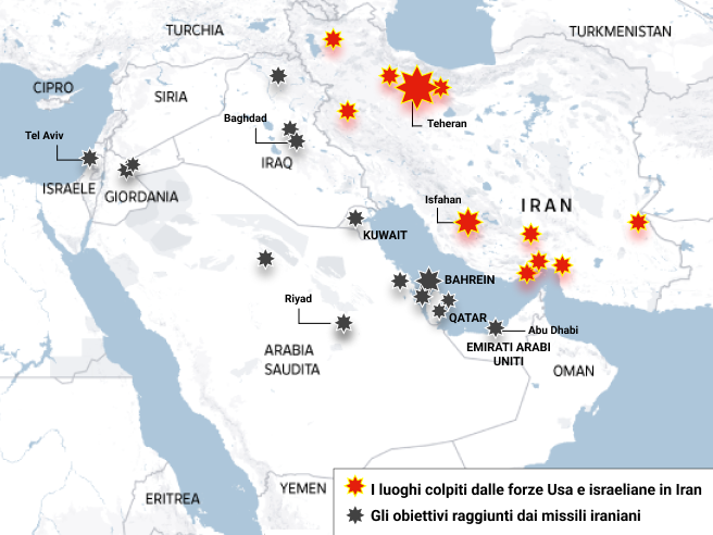 La reazione di Teheran è stata immediata e su più fronti. Iran ha lanciato missili balistici e droni verso il territorio israeliano e le basi americane dislocate nei Paesi del Golfo, tra cui Emirati Arabi Uniti, Qatar, Bahrein e Kuwait. Allo stesso tempo, milizie alleate come Hezbollah hanno intensificato gli attacchi contro obiettivi israeliani dal Libano, ampliando le operazioni militari a un fronte più vasto del Medio Oriente. Ci sono state segnalazioni di colpi anche contro marine mercantili nel Golfo e danni a infrastrutture civili in varie capitali della regione.
