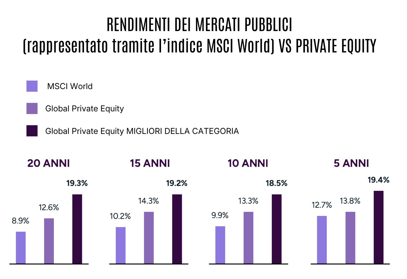 Storicamente, private equity, venture capital e private credit hanno reso più dell’azionario quotato. Il premio di illiquidità — accettare un vincolo temporale — viene pagato.